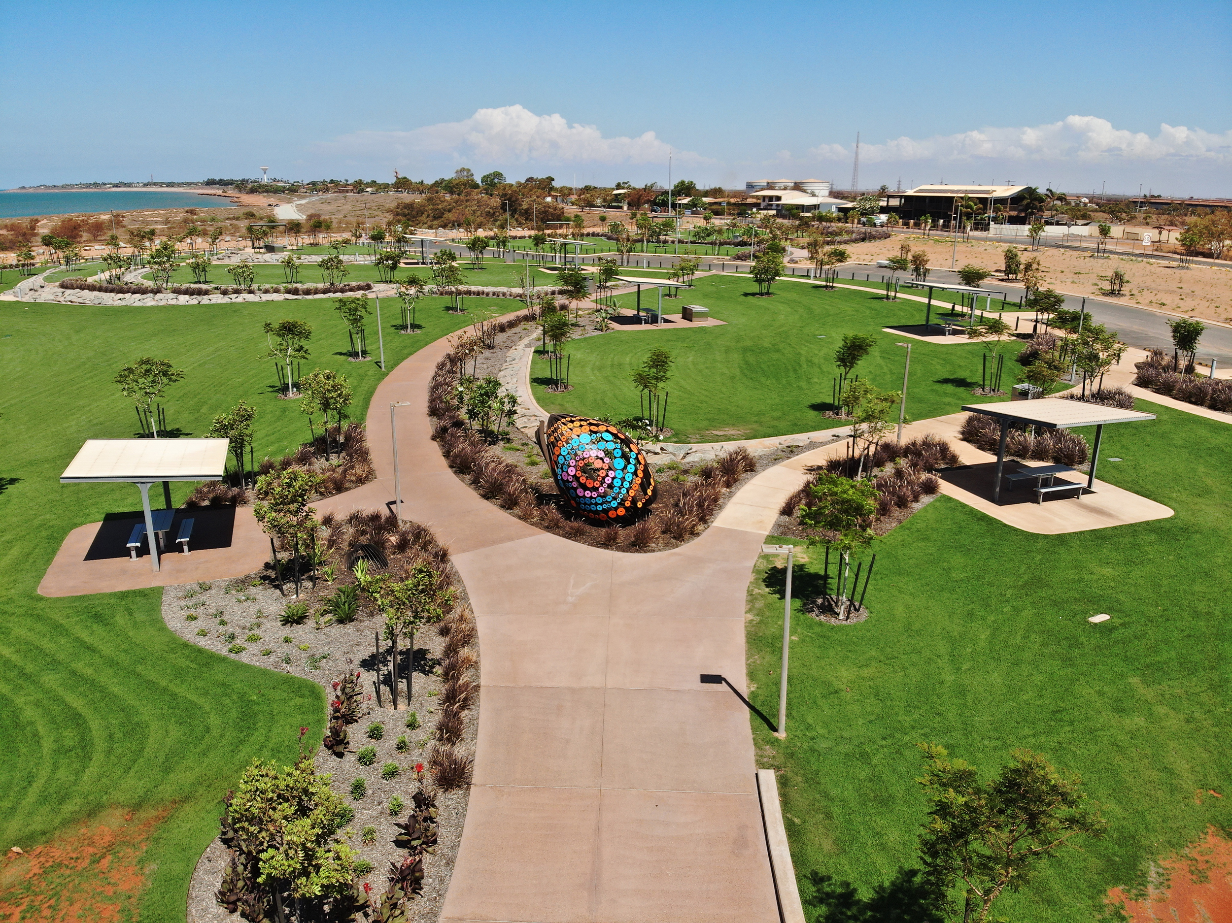 • Application-specific design: Pathways and carparks met AS1158 categories without excess light; playgrounds benefitted from ambient spill contribution; and The Gathering sculpture was softly highlighted with PC Amber ETC320 inground uplights, enhancing cultural value without compromising dark-sky principles.